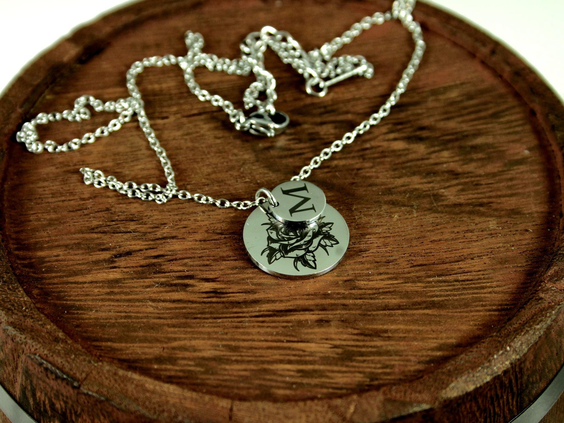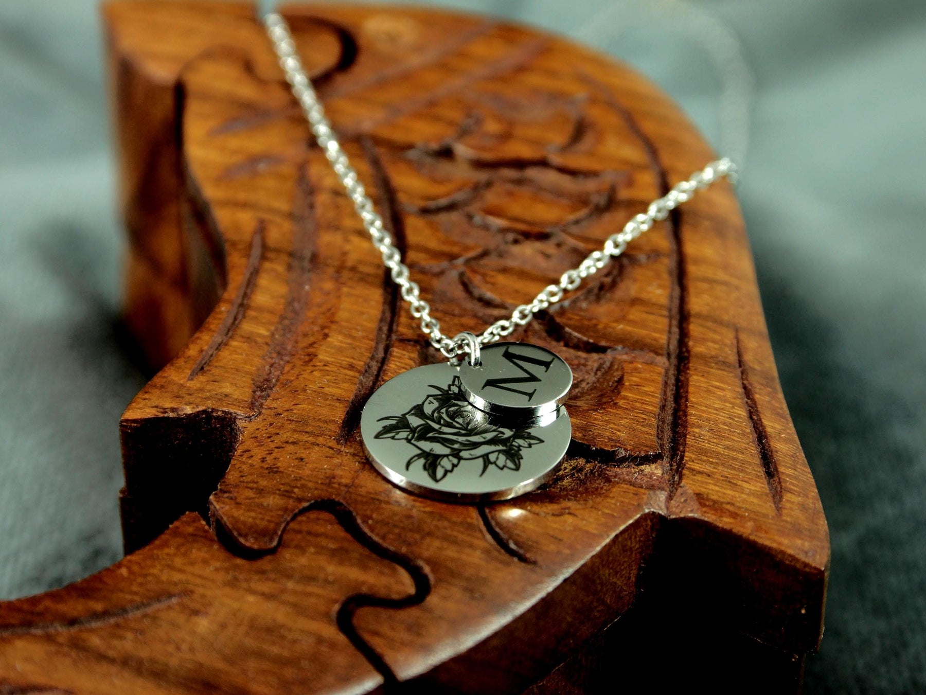 This birth flower pendant necklace is a delicate keepsake featuring a beautifully detailed engraved flower of your chosen month alongside a custom initial. Made with PVD coated silver stainless steel, it’s lightweight, hypoallergenic, and designed for everyday wear with a dainty chain that complements any style.