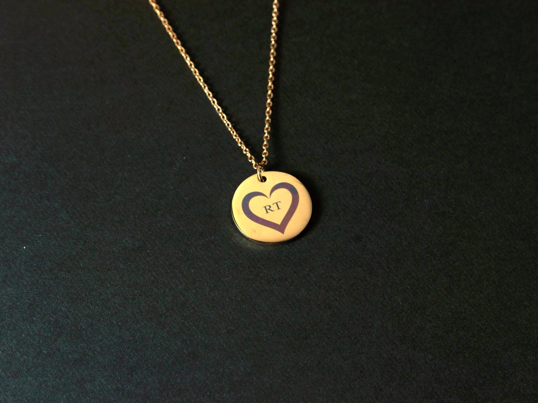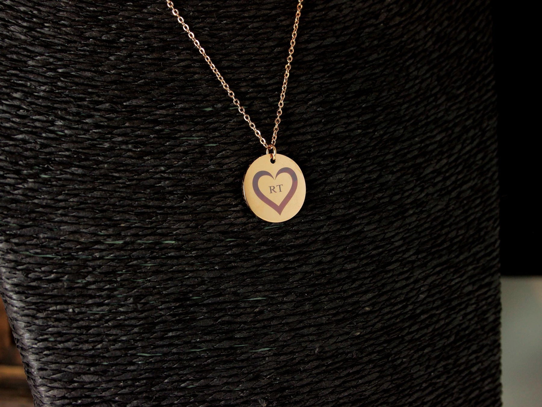 ✨ FEATURES Circle pendant with heart engraving Personalised with initials of your choice Stainless steel with rose gold PVD coating Dainty matching rose gold chain included Durable, tarnish-resistant, and hypoallergenic Elegant design for daily wear or special occasions Beautifully packaged, ready for gifting