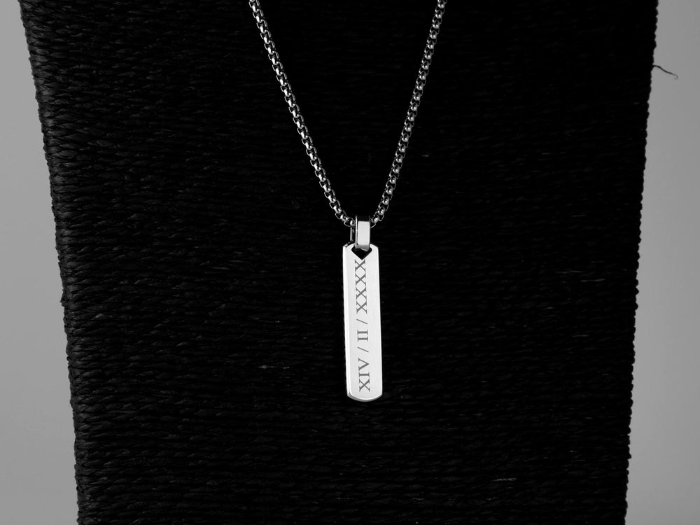 Celebrate a meaningful date with this Silver Thick Bar Pendant, personalised with Roman numerals. Crafted from durable stainless steel, its bold yet refined design makes it a powerful reminder of love, milestones, or unforgettable moments. A statement piece that feels both ancient and modern — timeless in every way.