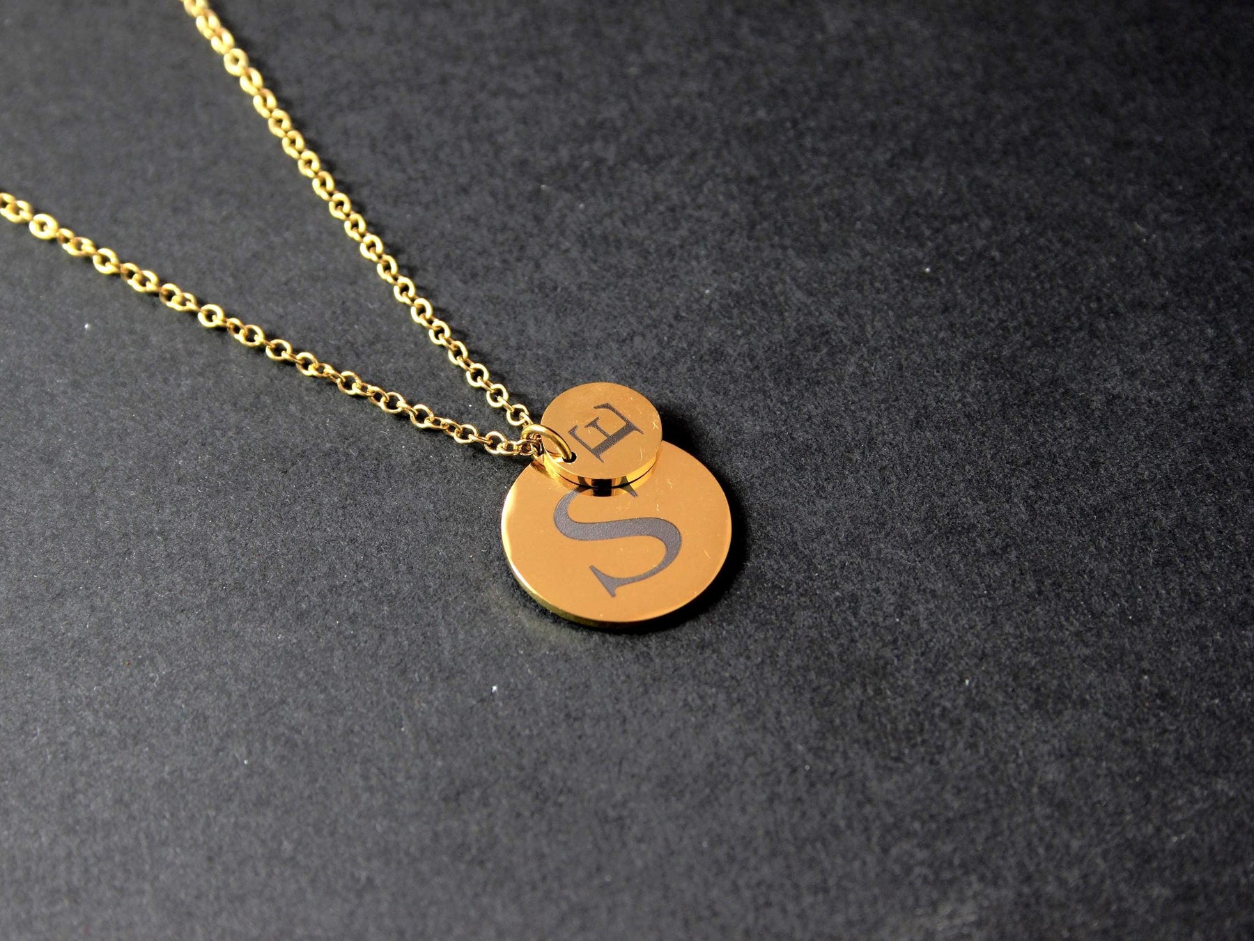✨ FEATURES Double circle pendant design Large + small initials engraved Stainless steel with PVD coating (Silver, Gold, Rose Gold) Matching chain included in your chosen finish Tarnish-resistant & hypoallergenic Elegant, minimalist style