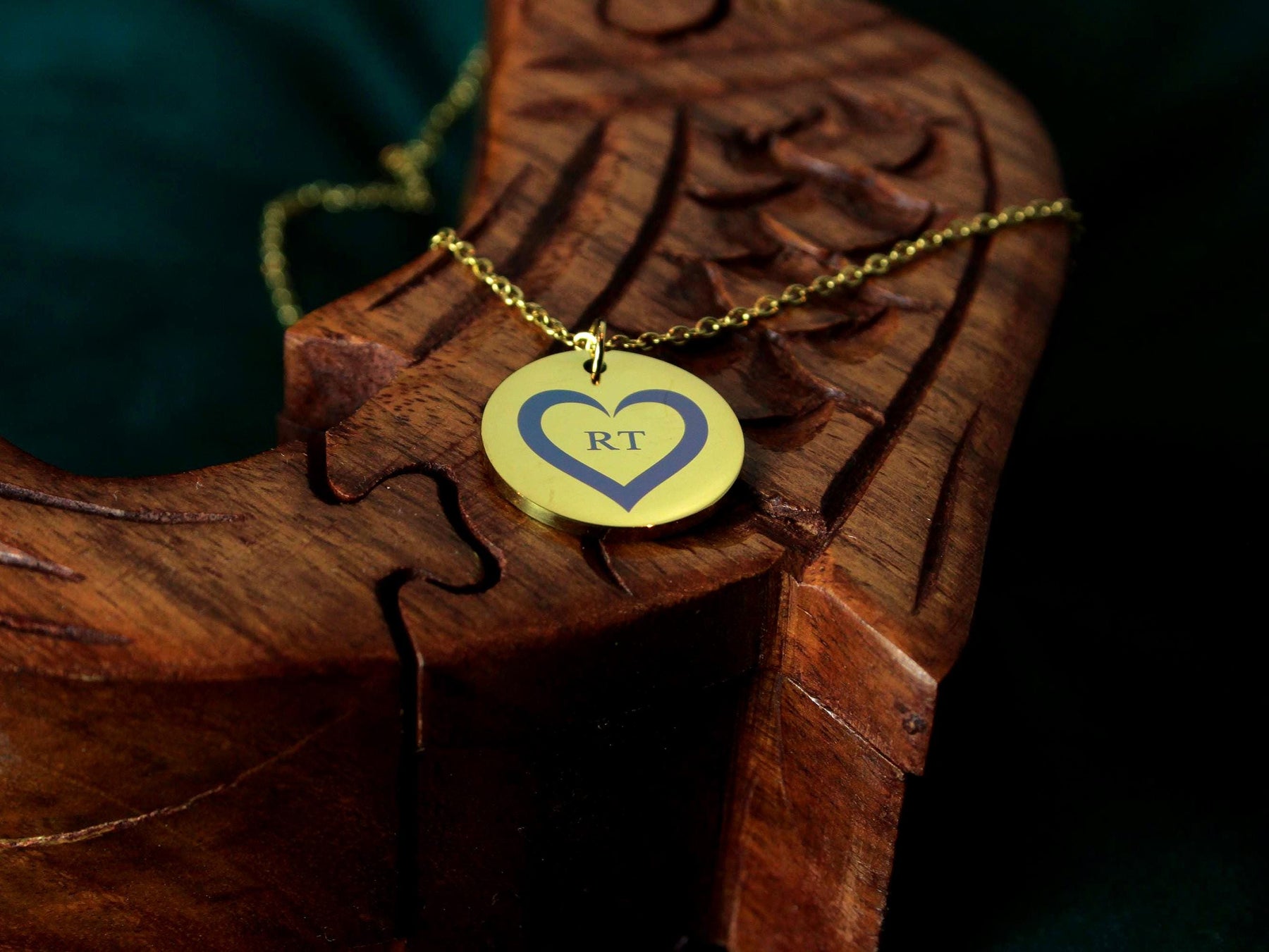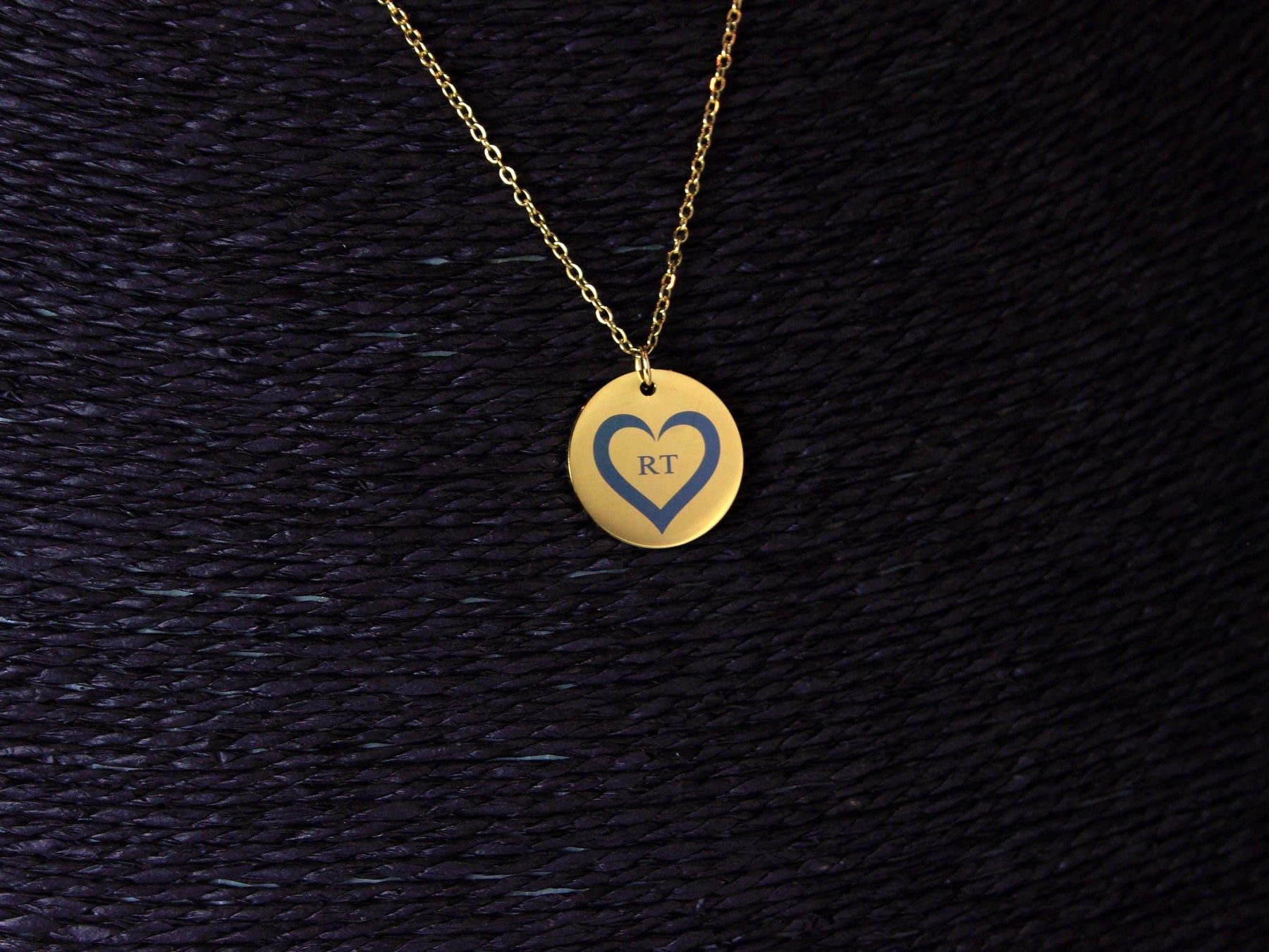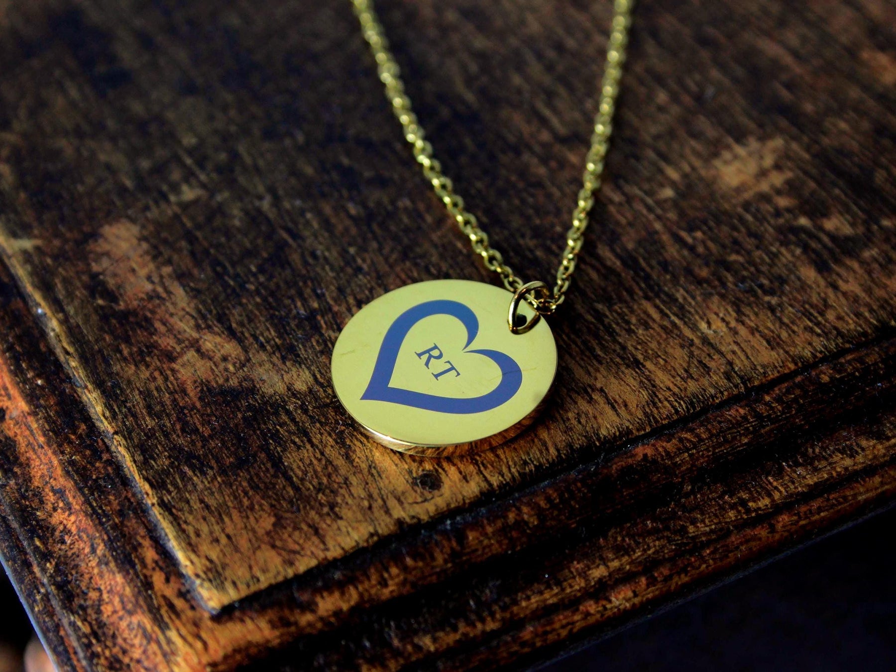 ✨ FEATURES Gold circle pendant with heart + initials PVD gold coating over stainless steel Matching dainty gold chain included Durable, tarnish-resistant finish Minimalist yet romantic design Engraved with precision for lasting detail