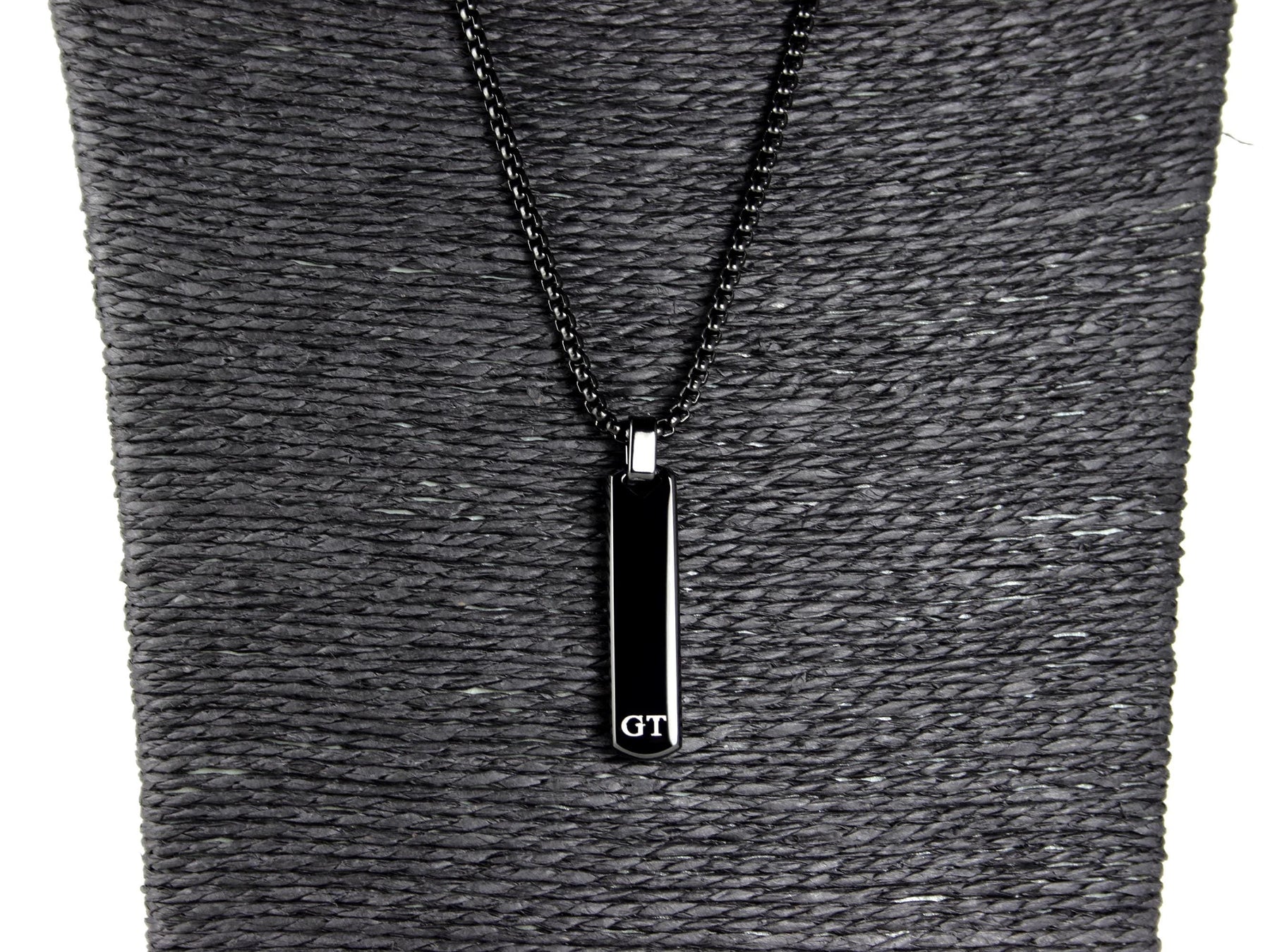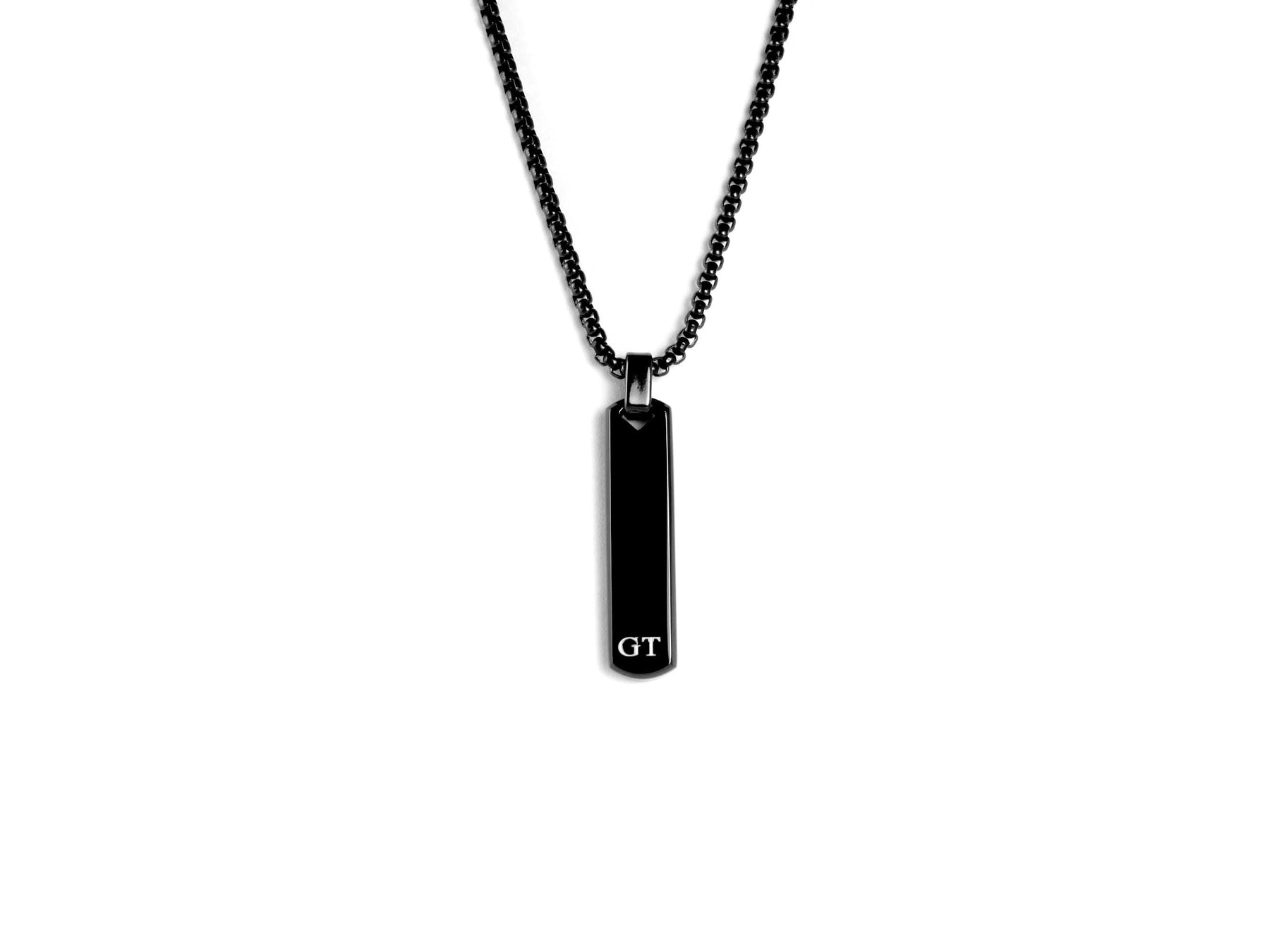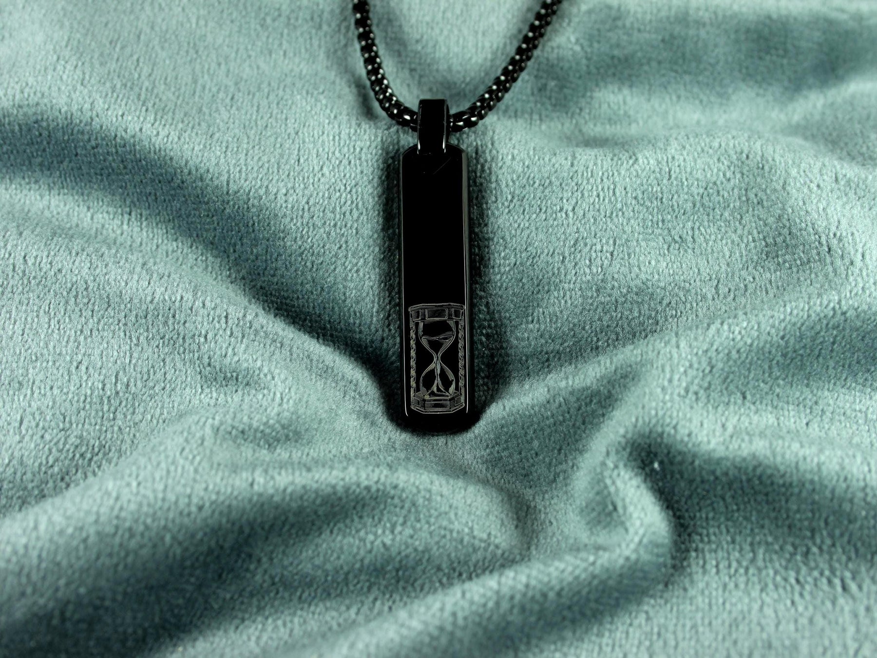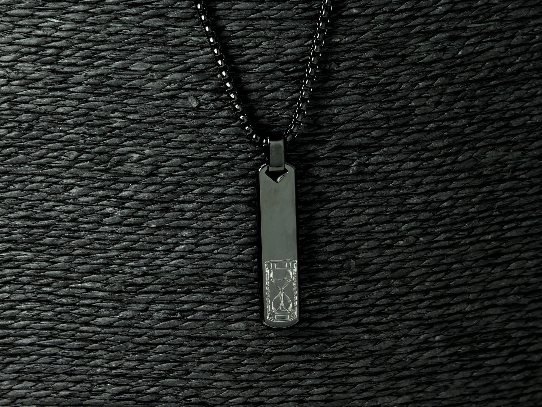 This Black Rectangle Sand Timer Pendant fuses a bold tattoo design with deep symbolism — a striking hourglass illustration representing impermanence, balance, and mindful living. Made from durable black PVD-coated stainless steel, this pendant is strong, modern, and powerful. Personalise the back with initials for a custom piece full of meaning and edge.