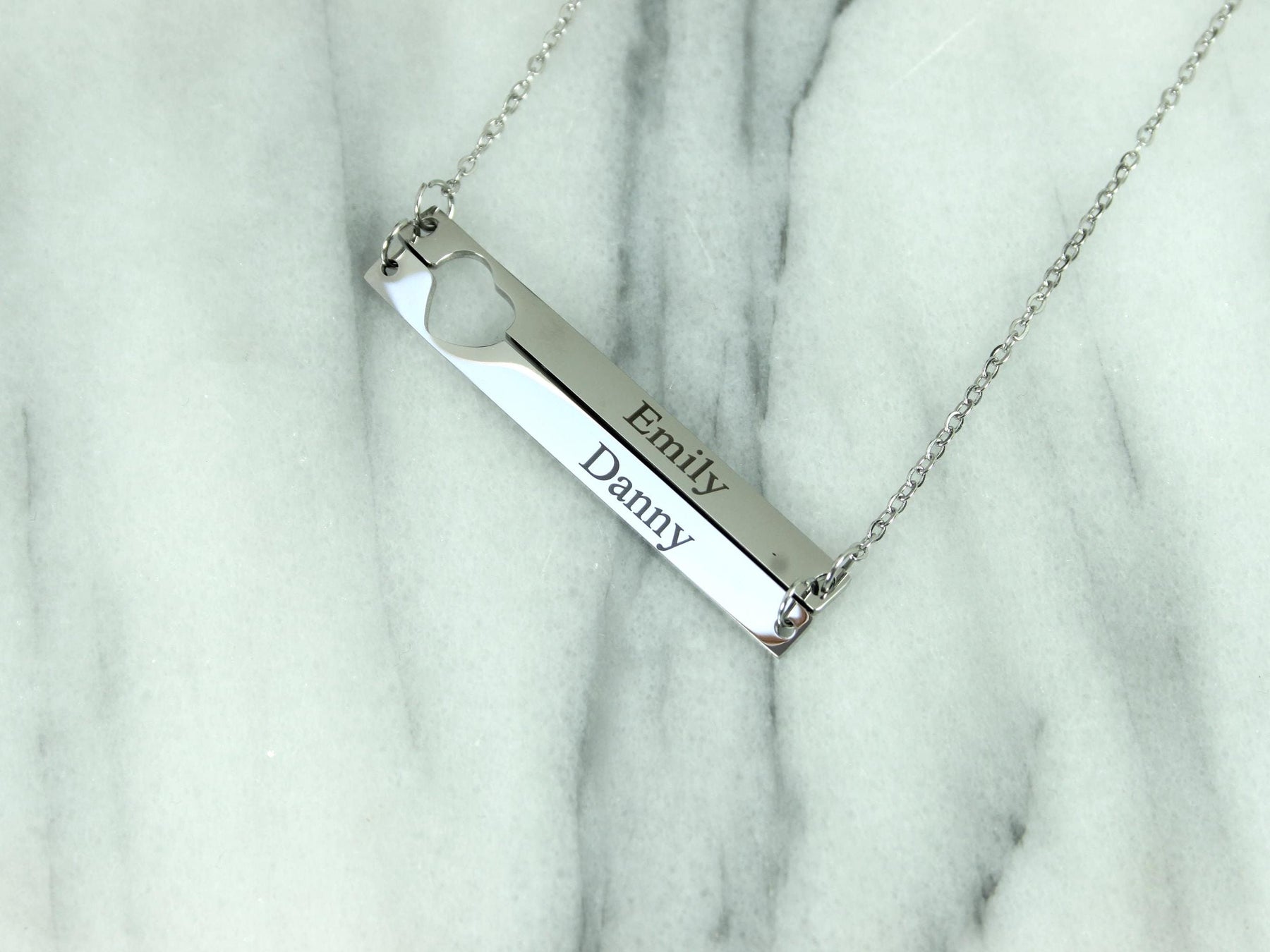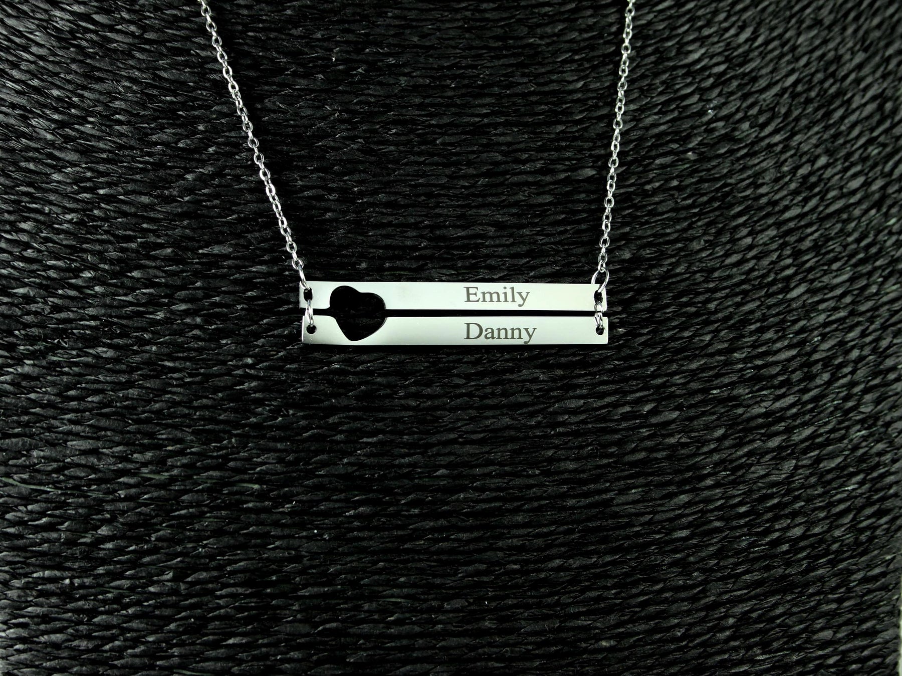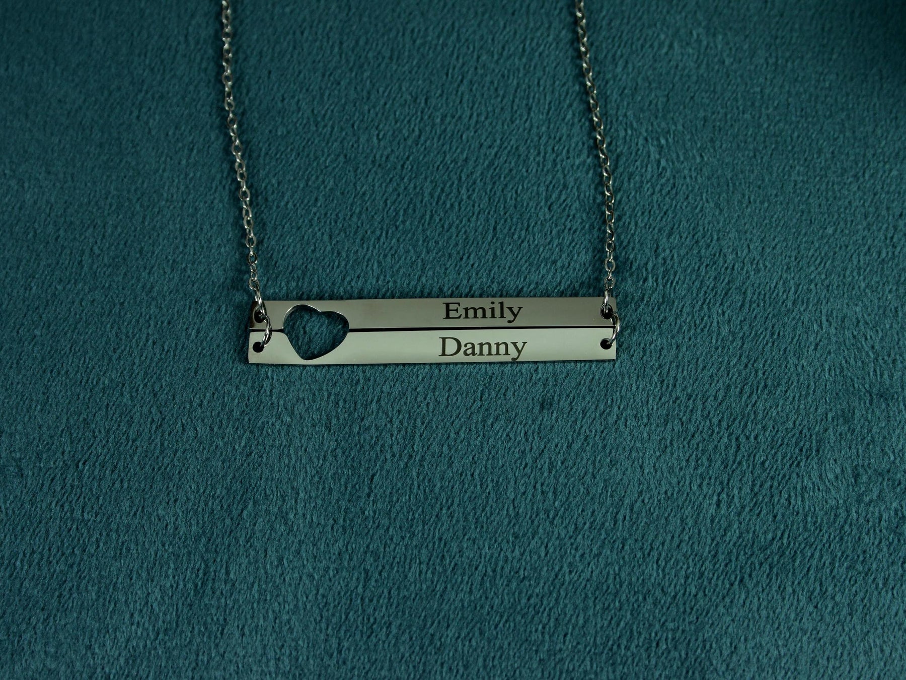 Keep your connection close with this Silver Double Bar Pendant, designed with custom engraved names on both the top and bottom bars. With a subtle heart cut-out detail and minimalist design, this makes the perfect keepsake for couples, family, or best friends — a meaningful symbol of togetherness.