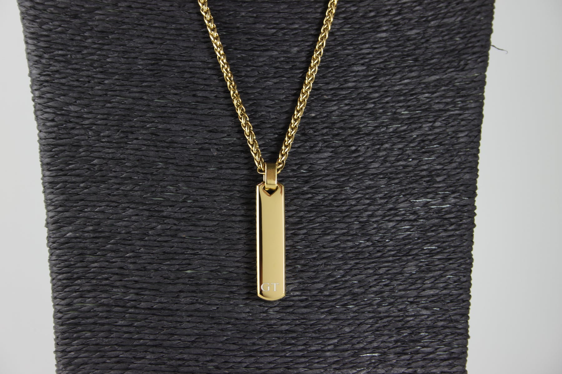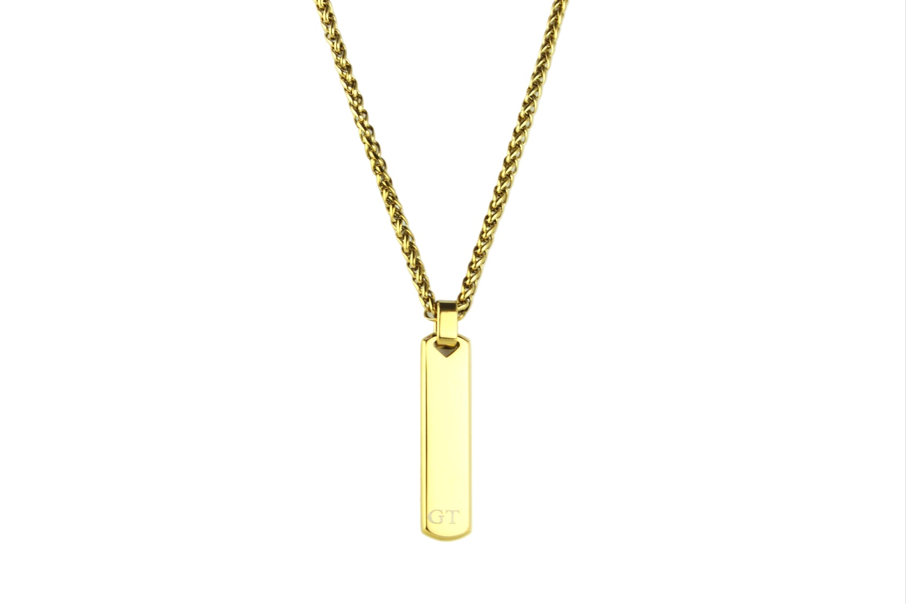 Gold Bar Pendant And Chain With Engraved Initials